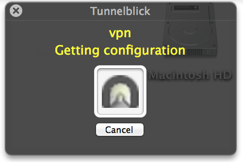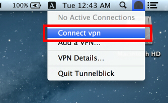 点击 Mac OS X 菜单栏的 Tunnelblick 图标,并点击 "Connect vpn" 。( "vpn" 部分可以变化。) VPN 连接将被发起。